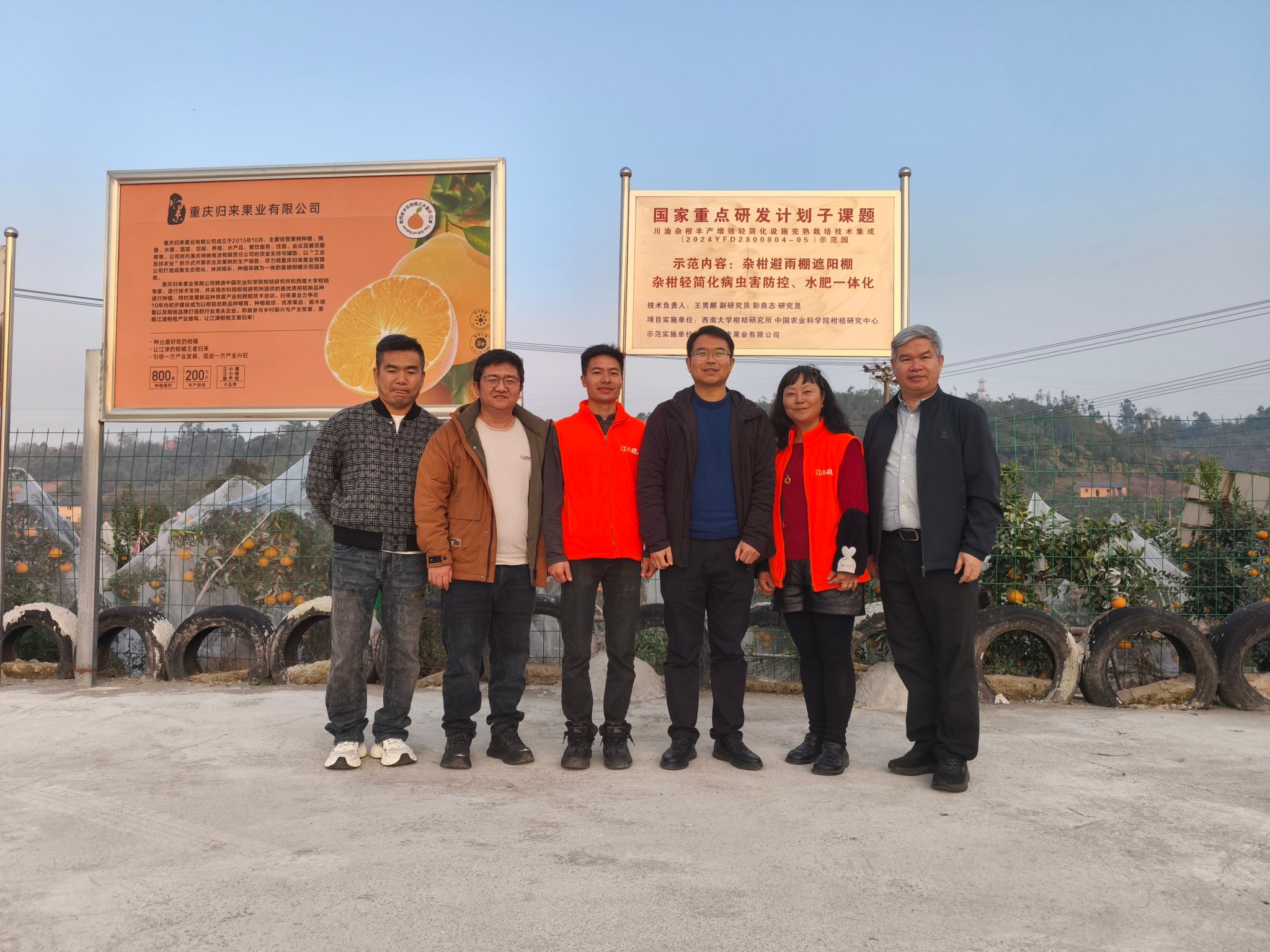 此外,12月7日,作为国家重点研发计划课题“柑橘设施辅助大面积丰产增效轻简化栽培技术集成示范”负责人,王鹏副所长一行参观了该课题下设的示范果园——重庆江津归来果业有限公司(王男麒副研究员为子课题负责人),果园董事长陈蓉和总经理张宗强陪同参观。王鹏副所长、徐建国研究员、吴永斌董事长针对如何更好地在川渝地区推进设施辅助杂柑丰产增效工作提出了宝贵意见和建议。