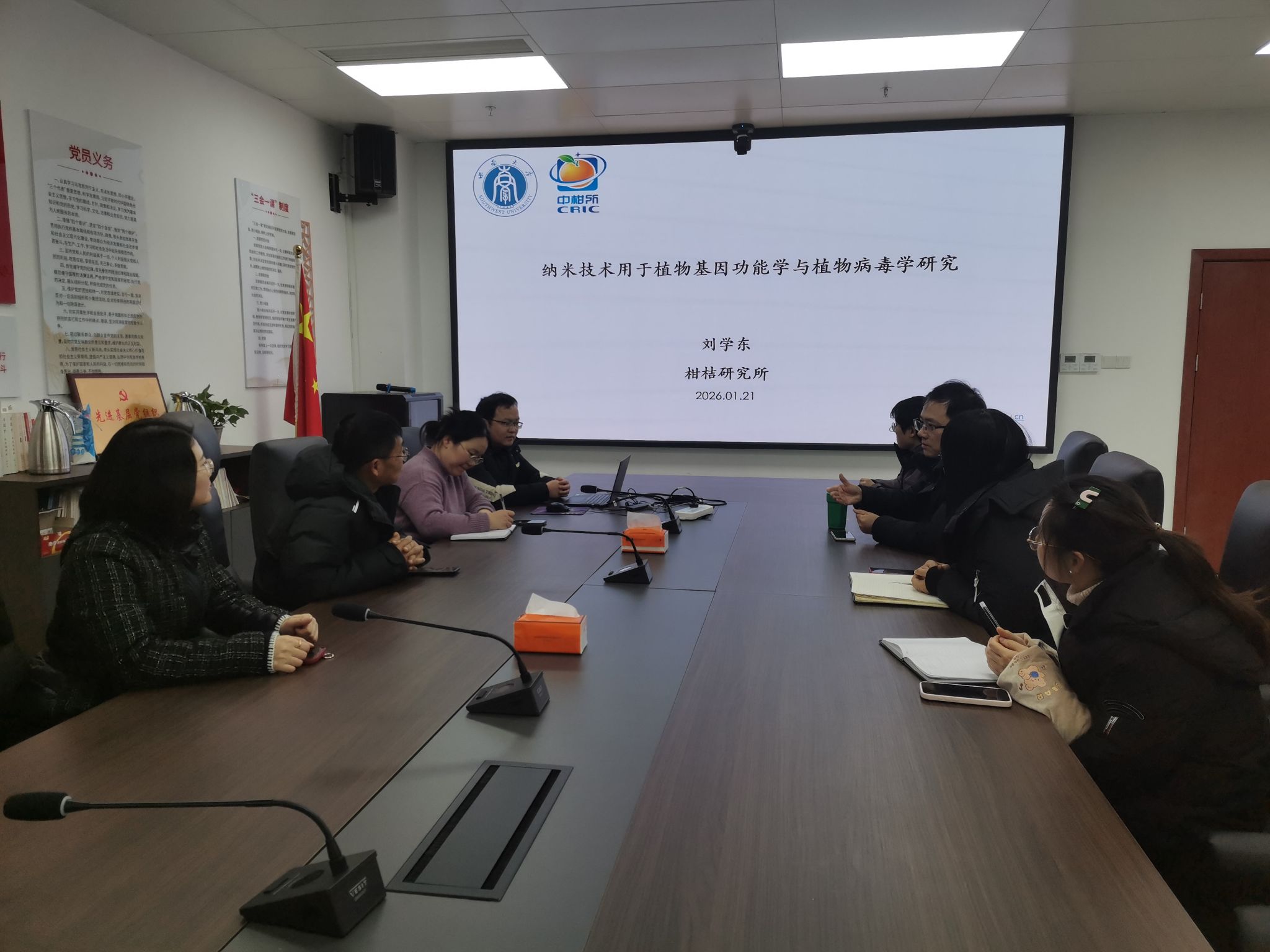 学术交流会上,胡新龙所长首先代表江西农科院园艺所对我所考察组的到来表示热烈欢迎,并全面介绍了该所在园艺领域科技创新突破、人才梯队建设与团队培育、科研成果转化应用等方面的丰硕成果,重点阐述了江西省柑桔产业的发展现状、核心优势及未来布局,为双方精准对接合作找准了切入点。曹孟籍副所长结合我所发展实际,详细介绍了西南大学柑桔研究所的发展历程、核心科研平台优势及近年来在柑桔育种、栽培、病虫害防控等领域的标志性成果,并围绕国家自然科学基金项目申报的流程要点、选题技巧、团队协作等关键环节,分享了宝贵经验,为双方科研人员申报高水平项目提供了重要指引。刘学东副研究员作了题为“纳米技术用于植物基因功能学与植物病毒学研究”的专题报告,该研究为植物基因功能研究和病毒防控提供了全新思路,对解决柑桔产业生产中的实际问题具有重要启发意义。