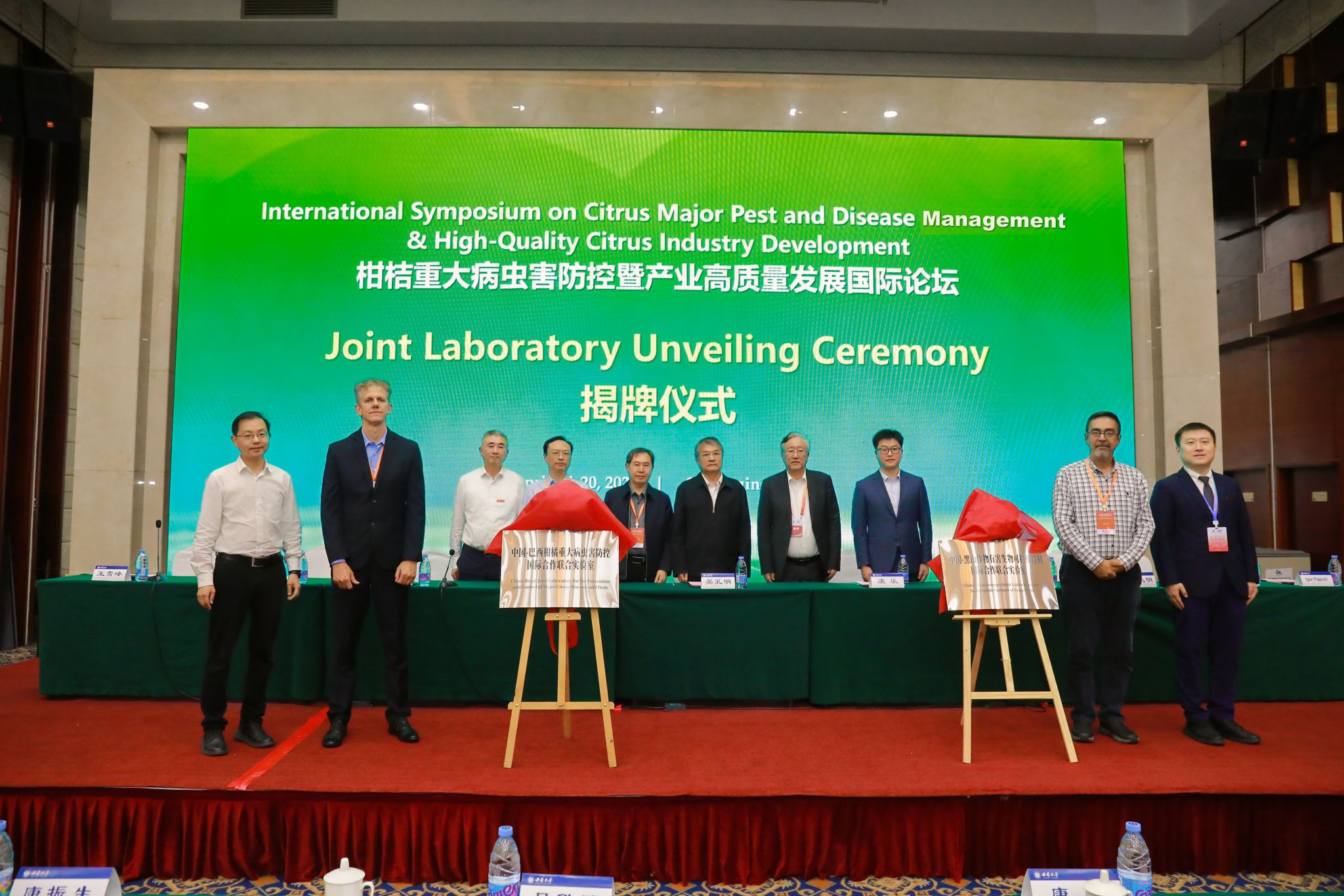 开幕式上还举行了中国—巴西柑桔重大病虫害防控国际合作联合实验室、中国—黑山作物有害生物可持续控制国际合作联合实验室揭牌仪式,范大明副校长、巴西柑桔保护基金会首席科学家Nelson Wulff、黑山大学生物技术学院院长Igor Pajovic为联合实验室揭牌。两个实验室将聚焦跨境病虫害监测预警、抗性品种联合培育等领域开展国际合作研究。