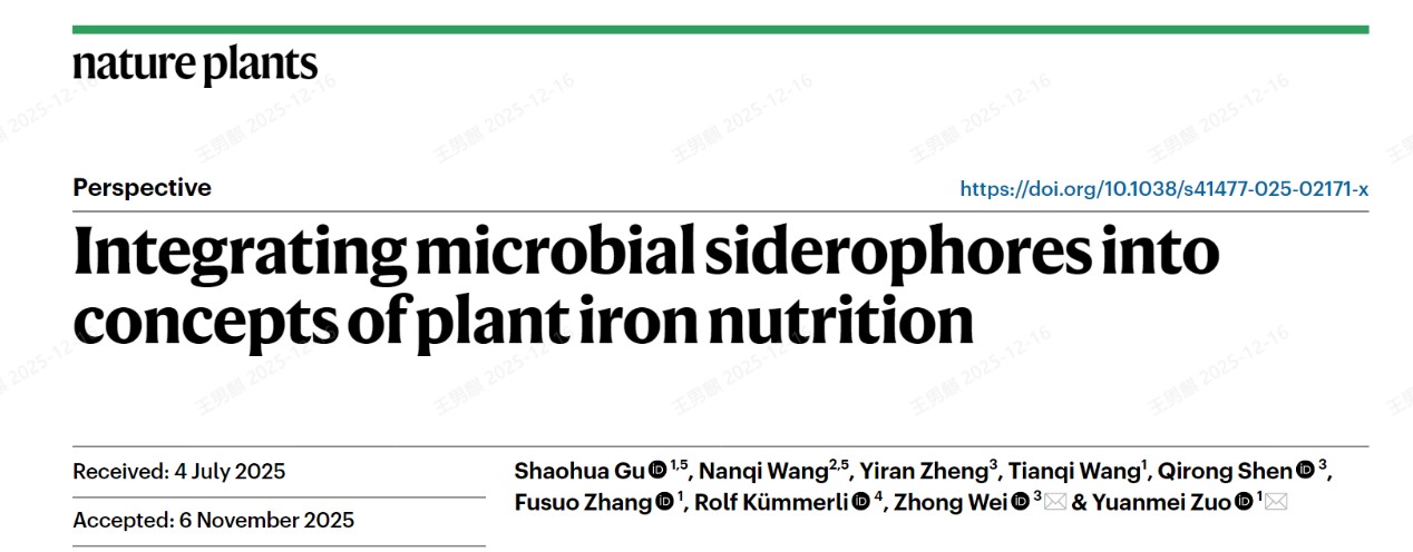 2025年12月15日,国际顶级学术刊物《自然植物》(nature plants)在线发表了中国农业大学左元梅课题组和南京农业大学韦中课题组合作的前瞻性观点文章“Integrating microbial siderophores into concepts of plant iron nutrition”,首次系统性提出植物铁吸收的“第三机制”(机理III),将根际微生物从辅助角色提升至与植物自身机制并重的核心地位。我所青年教师王男麒副研究员作为共同第一作者参与了这项研究。