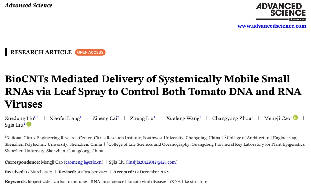 番茄是全球重要经济作物,但病毒病严重威胁产量与品质。尤其是番茄斑萎病毒(TSWV)、番茄花叶病毒(ToMV)和番茄黄化曲叶病毒(TYLCV),可造成高达100%的产量损失,且缺乏有效化学药剂。RNA干扰(RNAi)技术被认为是未来植物病毒防控的重要方向,但外源dsRNA/shRNA稳定性差、移动性弱、作用时间短,限制了其在田间的应用。2025年12月22日,西南大学柑桔研究所曹孟籍团队在国际权威期刊 《Advanced Science》 在线发表题为《BioCNTs Mediated Delivery of Systemically Mobile Small RNAs via Leaf Spray to Control Both Tomato DNA and RNA Viruses》的研究论文。该研究首次构建了生物碳纳米管(BioCNTs)系统性移动RNAi纳米生物农药平台,实现了对番茄多种重要病毒(ToMV、TSWV、TYLCV)的高效、持久、系统性防控,为绿色农业提供了全新的解决方案。
