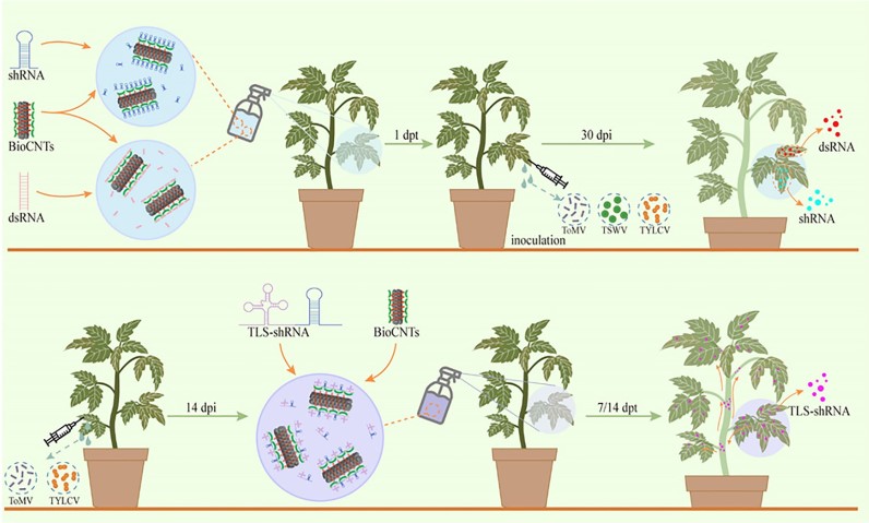研究团队基于自主开发的BioCNTs纳米载体,成功实现了外源RNA分子的高效装载、稳定保护与快速进入植物细胞,并显著延长了dsRNA/shRNA的沉默持续时间;同时创新性地将在植物中具有系统移动能力的tRNA-like structure(TLS)序列引入shRNA前端,使喷施后进入植物细胞中的RNA获得长距离运输能力,从而在未喷施的上位叶中仍保持显著防效。该系统在番茄中对三种重要病毒均表现出强抑制效果,且对植物生长、光合作用和免疫系统无明显负面影响,果实对哺乳动物无明显毒性,展现出安全、绿色、可规模化应用的巨大潜力,为RNA农药的田间落地提供了关键技术突破,也为植物病毒病的精准、可持续防控开辟了新的研究方向。