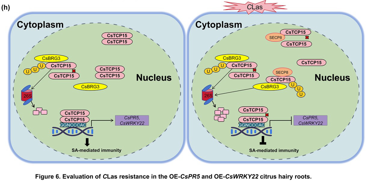 进展1:前期研究发现CLas效应蛋白SECP8具有免疫抑制作用,但其分子机制尚不明确。2025年12月12日, 西南大学柑桔研究所周常勇研究员团队在国际期刊《Plant Biotechnology Journal》发表题为“‘Candidatus Liberibacter Asiaticus’ Effector SECP8 Subverts Salicylic Acid-Mediated Citrus Immunity via a Two-Pronged Impairment of CsTCP15 Dimerization”的研究论文,揭示了CLas效应蛋白SECP8通过直接抑制二聚化及间接促进泛素化降解的双重策略,靶向干扰柑橘正向免疫调控因子CsTCP15的功能,最终削弱水杨酸介导的宿主免疫,促进CLas增殖(图1)。该研究首次揭示了SECP8的致病分子机制,明确了CsTCP15-CsPR5/CsWRKY22在柑橘抗HLB中的核心作用,丰富了植物与病原细菌互作的分子理论。鉴定出CsTCP15、CsPR5、CsWRKY22等抗HLB关键靶标,为柑橘黄龙病抗性育种提供了新的分子靶点。