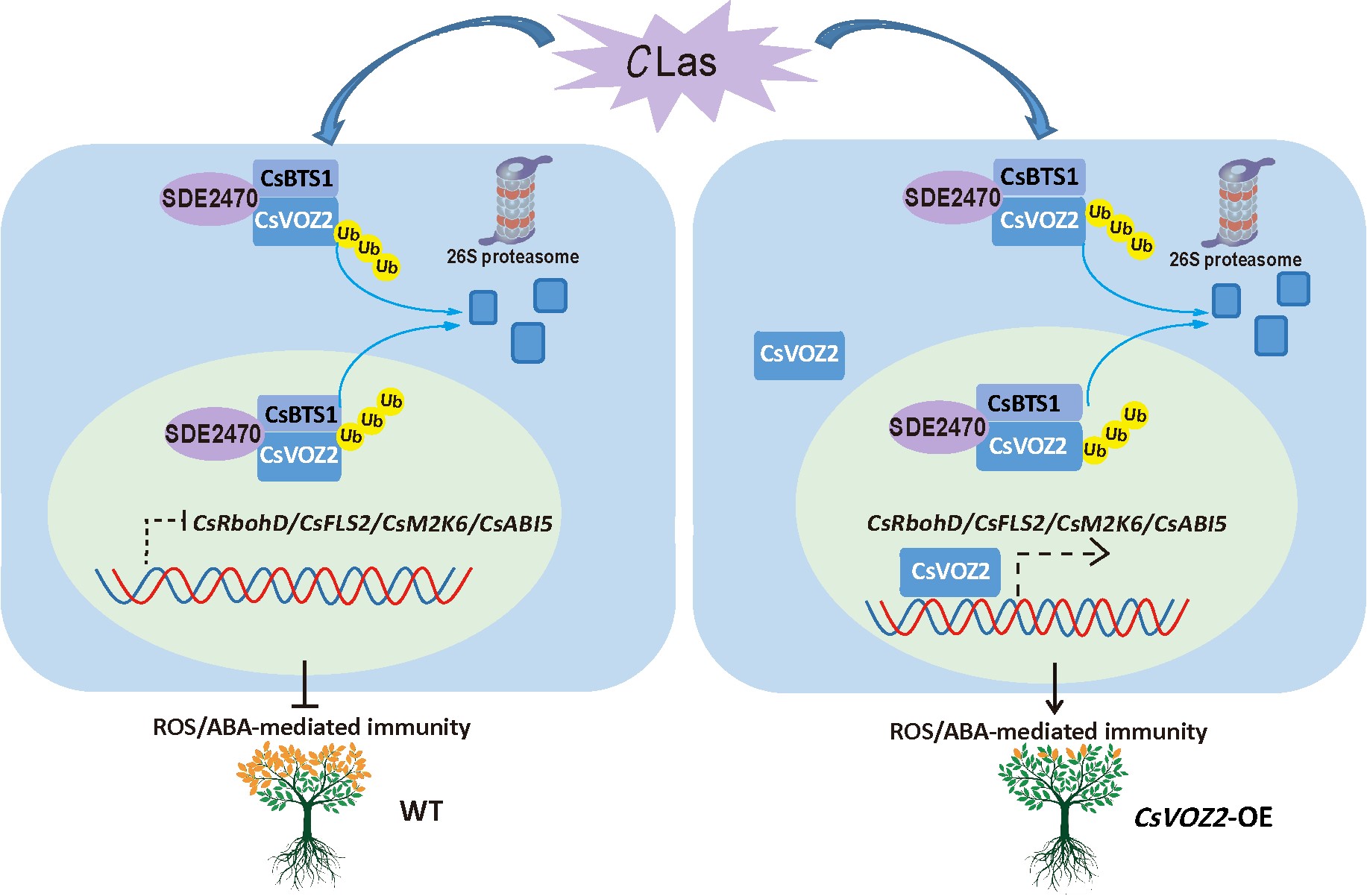 进展2:前期研究表明效应蛋白SDE2470能介导柑橘的JA途径抑制植物免疫,促进对木虱吸引及CLas增殖,但效应蛋白具有多功能性,对其致病机制的理解还比较局限。2025年12月19日,西南大学柑桔研究所傅仕敏副研究员在国际期刊《PLOS Pathogens》发表题为“A ‘Candidatus Liberibacter asiaticus’ effector SDE2470 facilitates citrus transcription factor CsVOZ2 degradation via BRUTUS E3 ligases”,揭示了CLas效应蛋白SDE2470通过增强E3泛素连接酶CsBTS1E3活性促进 CsVOZ2泛素化降解,随后可能通过抑制对下游基因的转录调控破坏ROS和ABA介导的防御反应从而促进CLas增殖(图 2)。本研究为柑橘黄龙病抗性育种提供明确分子靶点,即可通过基因编辑强化CsVOZ2表达、抑制CsBTS1E3活性,开发抗病柑橘品种。