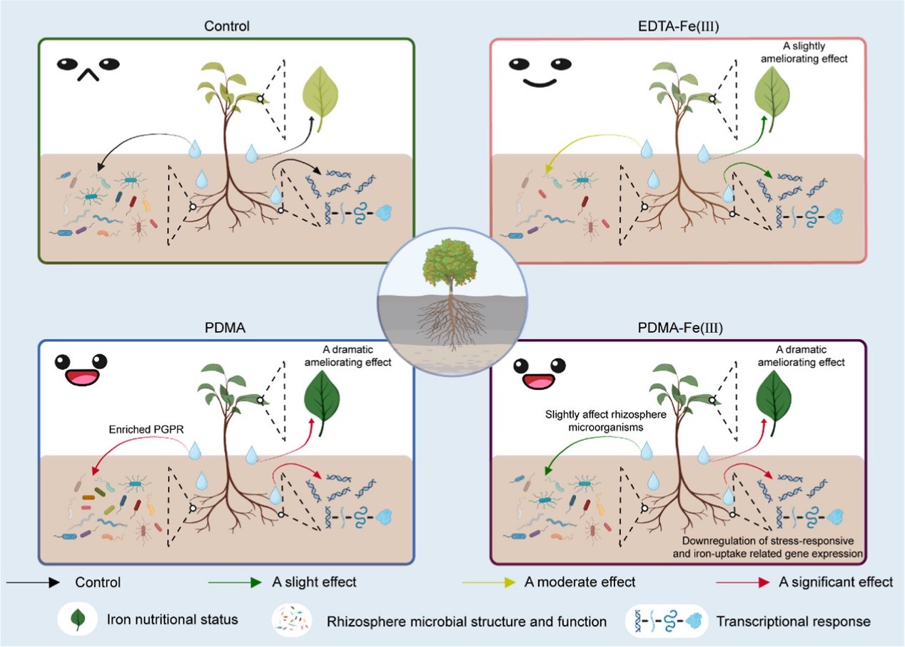 为破解这一难题,研究团队开展了盆栽与田间试验,整合生理测定、RNA测序、16S rRNA测序及宏基因组学等多组学技术,系统评估PDMA及其螯合物PDMA–Fe(III)对柑橘铁营养、产量、根系基因表达及根际微生物动态的影响。结果显示,PDMA与PDMA–Fe(III)均显著缓解柑橘缺铁黄化,且效果优于传统EDTA–Fe(III)铁肥。