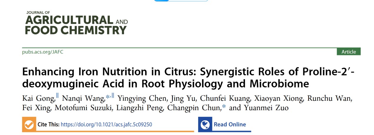 2026年1月9日,西南大学柑桔研究所栽培与生理中心淳长品、王男麒团队在国际一区TOP期刊《Journal of Agricultural and Food Chemistry》发表题为“Enhancing Iron Nutrition in Citrus: Synergistic Roles of Proline-2′-deoxymugineic Acid in Root Physiology and Microbiome”的研究论文,系统揭示了新型植物铁载体类似物——脯氨酸-2'-脱氧麦根酸(PDMA)调控柑橘铁营养的分子与生态机制,为碱性土壤柑橘缺铁问题提供了高效、环保的创新解决方案,对推动柑橘产业绿色可持续发展具有重要意义。