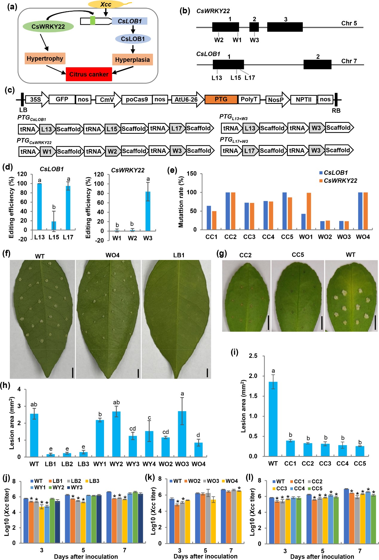 柑橘溃疡病是由柑橘黄单胞菌柑橘亚种引起的毁灭性细菌病害,给全球柑橘产业造成了巨大的经济损失,而绝大多数栽培品种均感病,开发高效抗病品种一直是柑橘育种的核心目标。转录因子CsWRKY22和CsLOB1通过级联转录机制调控植物细胞发育,从而促进柑橘易感溃疡病。本研究利用CRISPR/Cas9技术结合tRNA-gRNA加工系统(PTG策略),在晚锦橙和卡里佐枳橙中成功实现对CsLOB1和CsWRKY22的高效共编辑,双基因的突变率达到100%,突变体植株的溃疡病抗性提高了55.9~86.2%。研究首次在柑橘中实现了对两个感病基因的共编辑,成功获得了高抗溃疡病的新种质,为利用多基因共编辑策略培育广谱抗病新品种提供了重要的技术和理论参考。