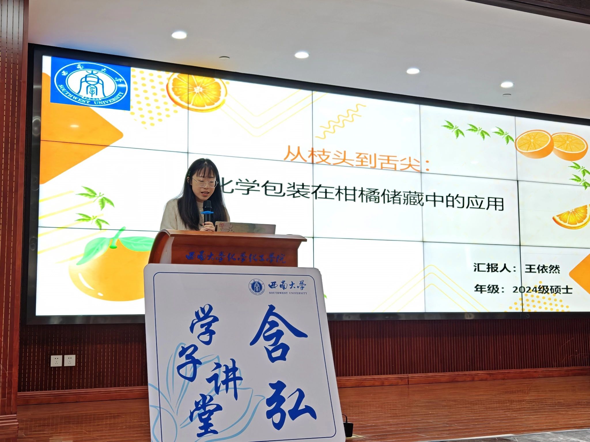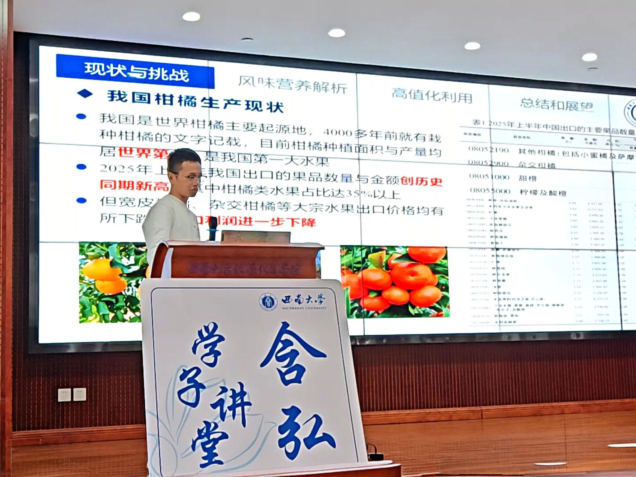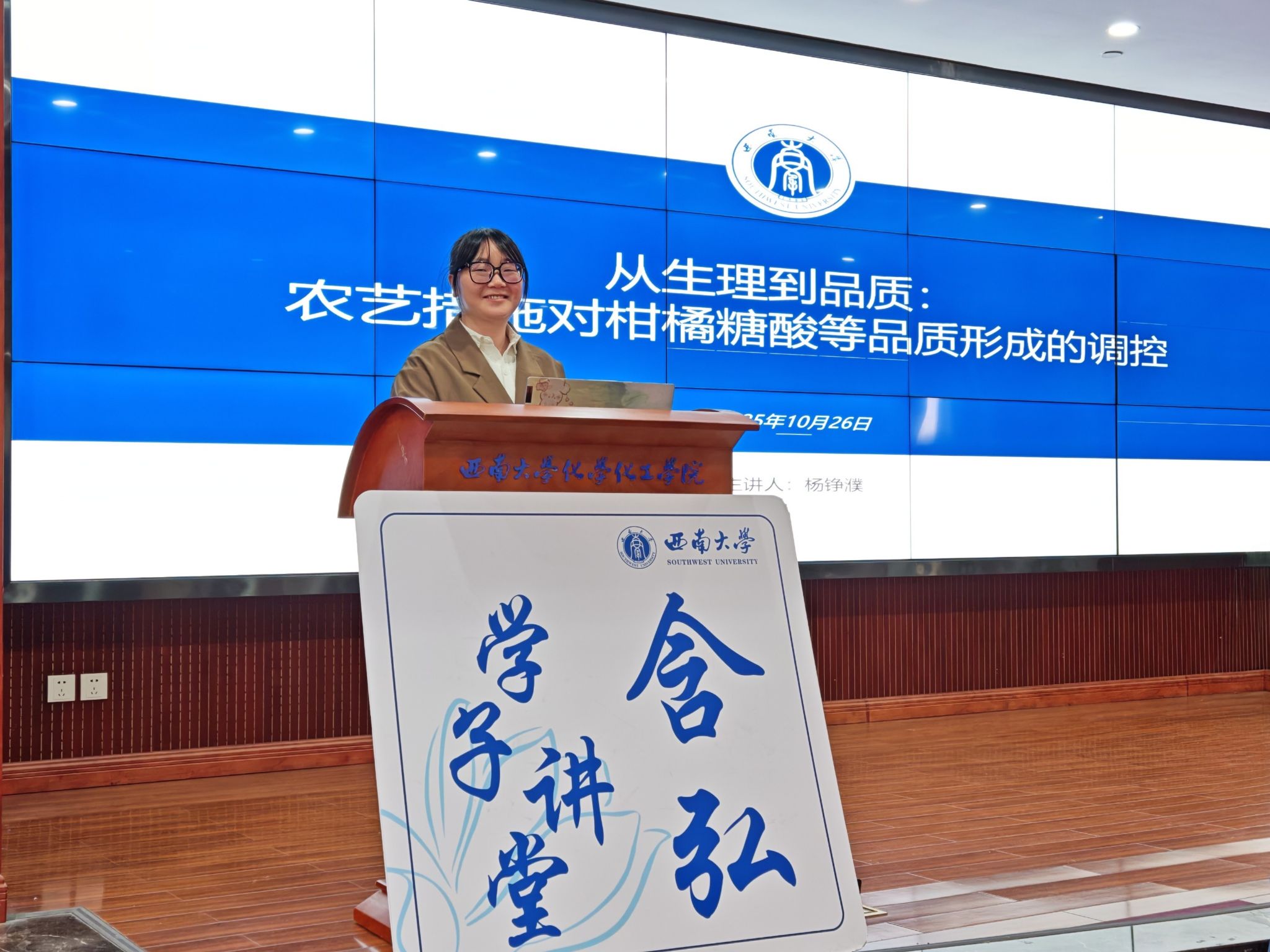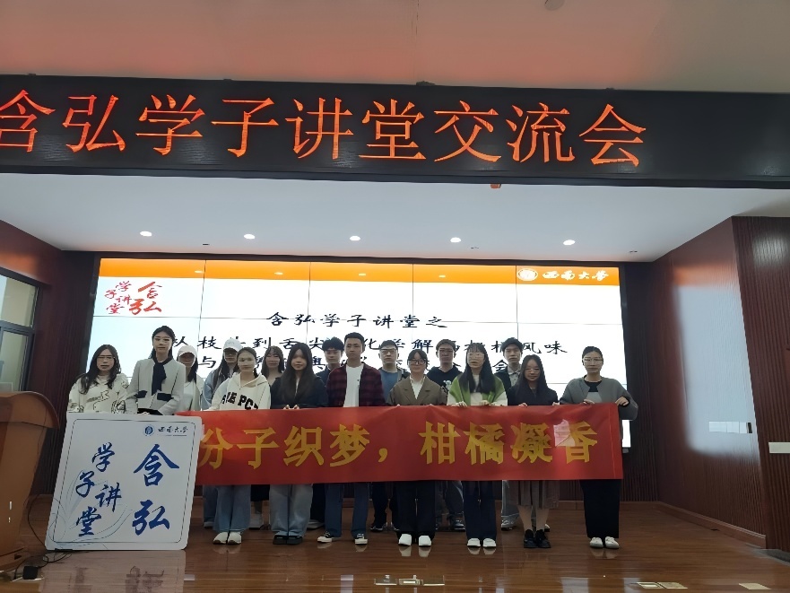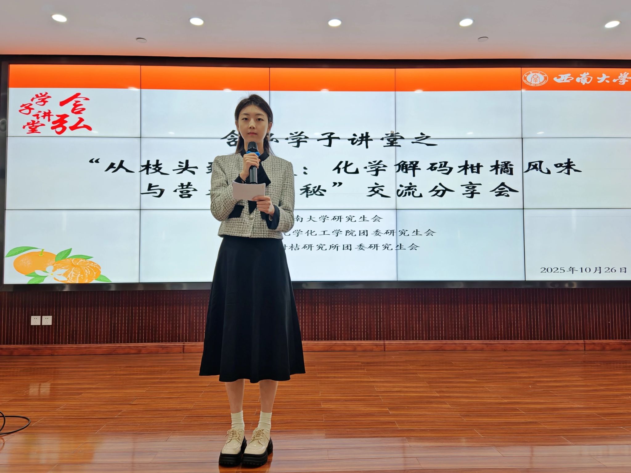 为促进学科交流、拓展研究视野,由西南大学研究生会主办,化学化工学院与柑桔研究所团委研究生会联合承办的含弘学子讲堂——“从枝头到舌尖:化学解码柑橘风味与营养的奥秘” 交流分享会,于2025年10月26日下午,在药化大楼B114教室圆满落幕。