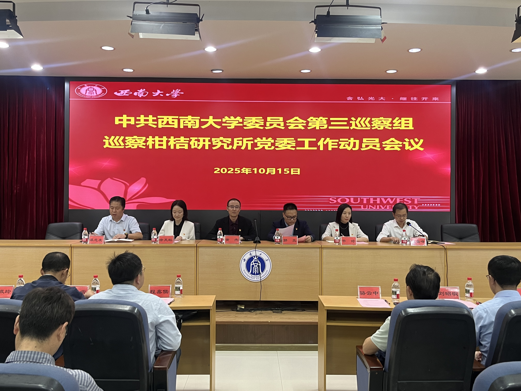根据中共西南大学第四届委员会第一轮巡察工作统一部署,10月15日下午,学校党委第三巡察组巡察柑桔研究所党委工作动员会议在柑桔所综合楼六会议室召开。校党委副书记、巡察工作领导小组副组长黄杰出席会议并讲话,第三巡察组组长,校纪委委员、教师教育学院党委书记郭亮作巡察工作动员讲话,校纪委副书记、纪委办主任、巡察办主任徐天虹,第三巡察组全体成员,所领导班子成员、全体教职工、离退休职工代表和学生代表参加动员会议。所长王雪峰主持会议。