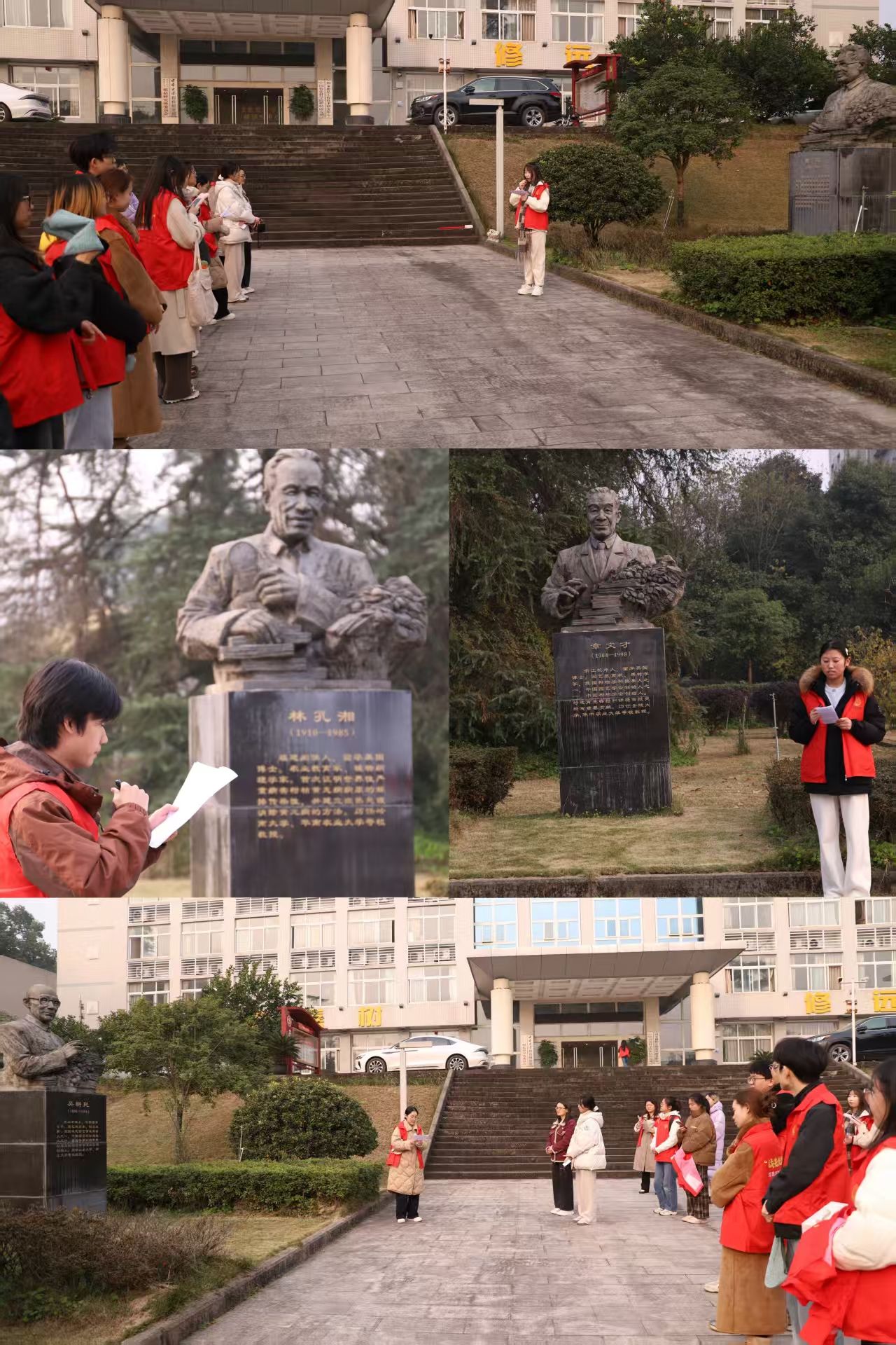 在综合大楼前,聂瑞、段秋媛、孟李涛、赵浩晴四位党员同志分别深情讲述了首任所长曾勉以及吴耕民、林孔湘、章文才四位先辈的感人事迹。从先辈们扎根科研、深耕柑桔领域的坚守,到他们心系家国、助力农业发展的担当,每一段故事都让在场党员深受触动,现场不时响起阵阵掌声。党员代表向先辈致敬献花,全体同志整齐列队合影留念,以此表达对先辈的缅怀与敬仰之情。党员们更深入感受到先辈们严谨求实、甘于奉献的科研精神,进一步明晰了作为柑桔领域科研后继者的责任与使命,推动先辈精神在青年党员中代代相传。