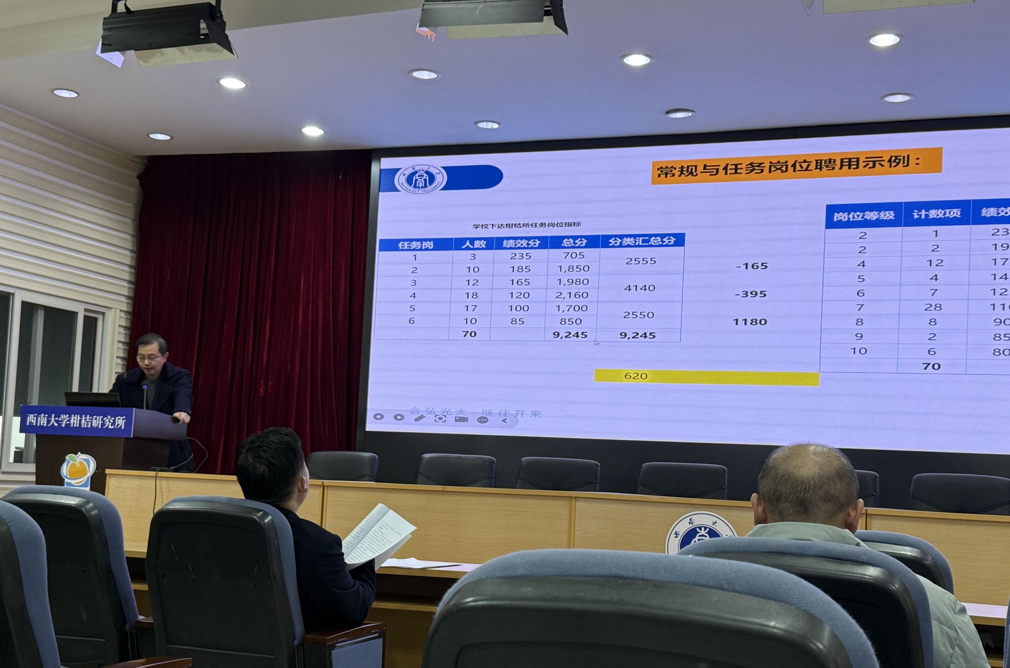 本次会议重点围绕两项议题展开,王雪峰所长从学校发展定位、高质量发展、柑桔所实际情况等,对《西南大学柑桔研究所绩效工资实施细则》进行细致解读。姜国金主任结合近年学校和所科研情况,对《西南大学柑桔研究所科研任务岗位确岗与考核细则》做了详细说明。两项细则的制定是我所深化内部改革、激发教职工积极性的重要举措。《绩效工资实施细则》旨在优化收入分配机制,体现多劳多得、优绩优酬的原则;《科研任务岗位确岗与考核细则》则聚焦岗位职责明晰化、考核科学化,为科研工作规范化提供制度保障。