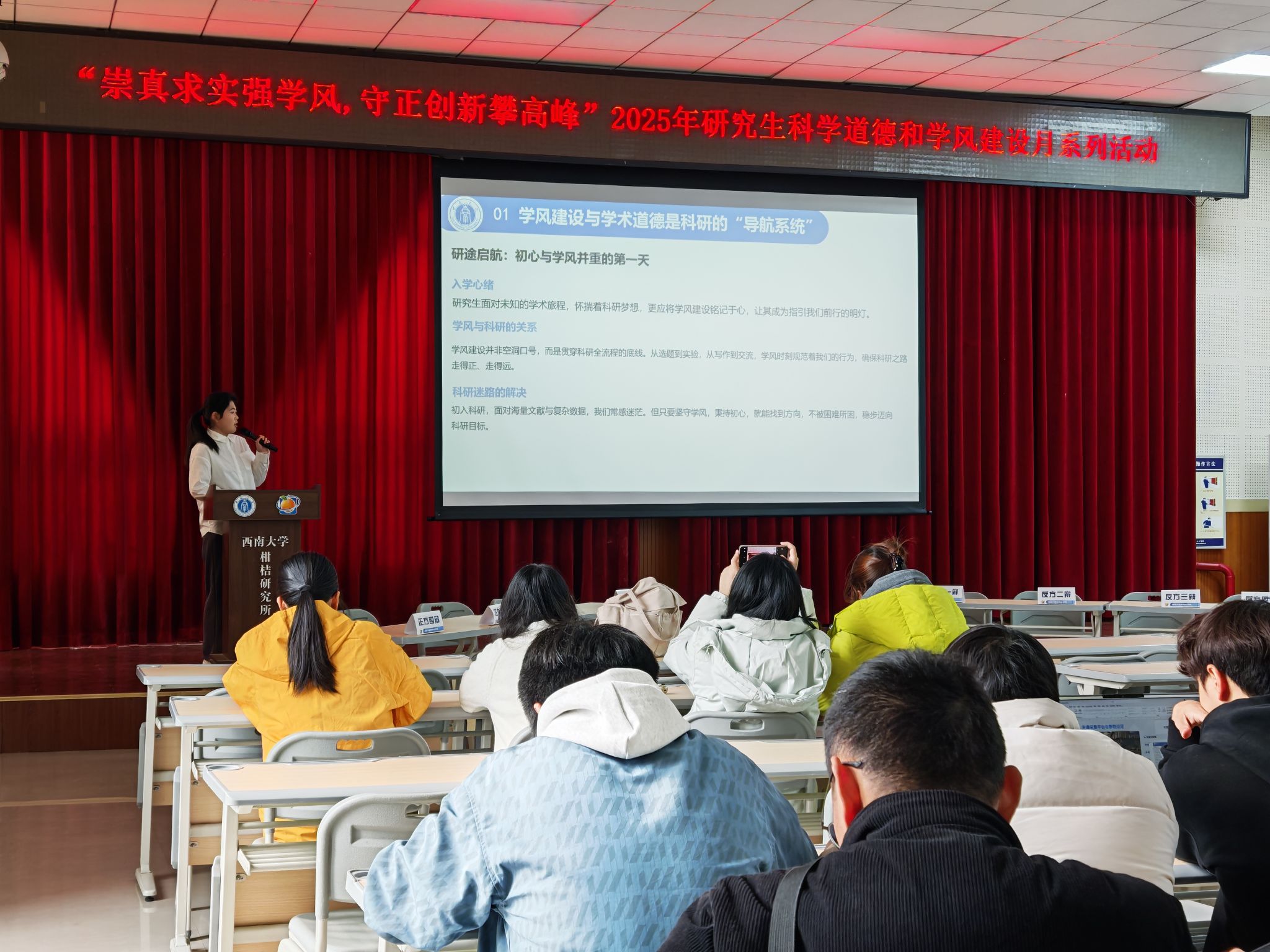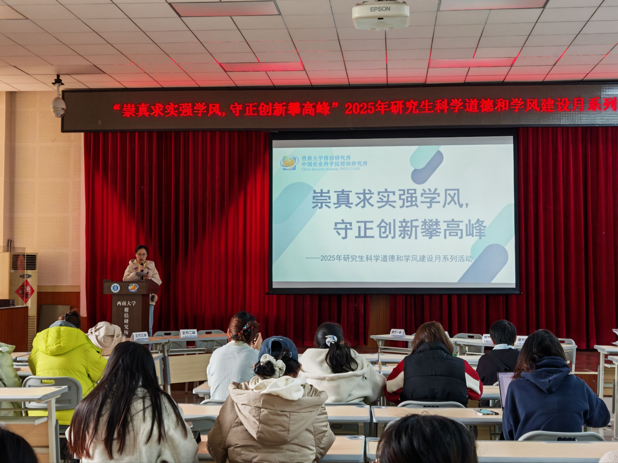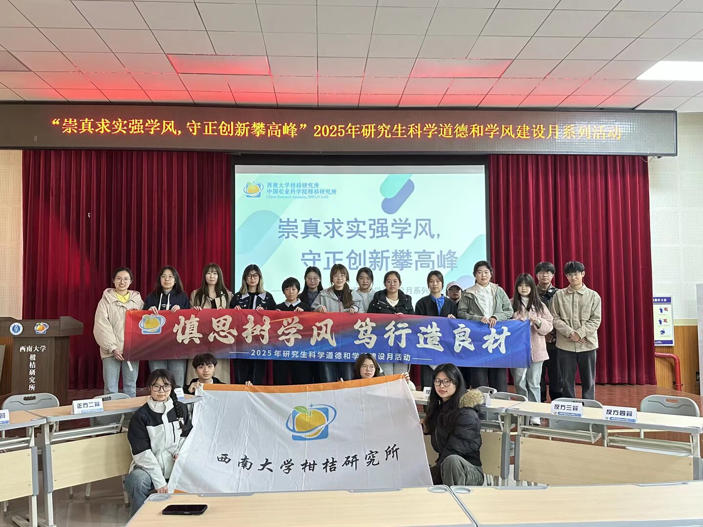 为深入贯彻落实科研诚信与学风建设相关精神,切实引导研究生严格恪守学术规范,2025年11月23日下午,西南大学柑桔研究所以“崇真求实强学风,守正创新攀高峰”为主题,在学生公寓二楼多功能厅成功举办科学道德与学风建设月系列活动。本次活动紧密围绕学术规范学习、科研经验分享及学风思辨交流三大核心板块,着力全面提升研究生学术道德认知水平与科研自律意识,为营造风清气正的学术生态环境奠定坚实基础。