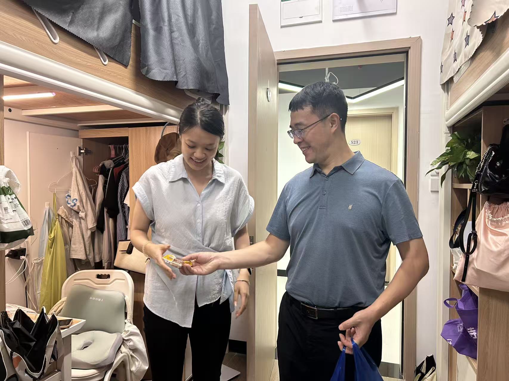 当天晚上刘昭暾副书记与辅导员曾晓琴带着月饼等节日慰问品逐间走进位于学校茶园七舍、八舍的研究生一年级学生宿舍,一方面细致地引导教育、排查安全隐患,确保宿舍的安全,另一方面,他们也不忘为同学们送上中秋的问候与暖心叮嘱。